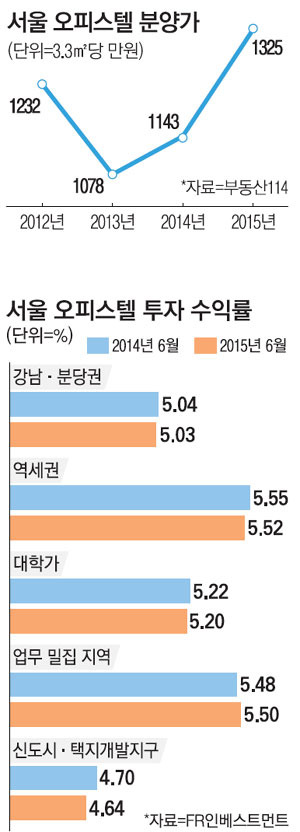 오피스텔 분양 시장이 열기를 더하고는 있지만 '빛이 밝을수록 그림자도 짙다'는 말처럼 어두운 면도 적잖다. 2010년부터 매년 1만실 넘는 물량이 시장에 나오는 와중에 높은 경쟁률에 이어 계약 마감까지 이어지는 사례가 속속 나오는가 하면 공급 과잉 염려와 함께 수익률 하락도 진행되고 있어서다. KB국민은행 부동산에 따르면 올해 상반기(1~6월) 오피스텔 임대수익률은 하락세다. 서울은 올 초 5.6%에서 6월 말 5.53%로 낮아졌고 같은 기간 경기는 6.16%에서 6.04%로, 인천은 7.12%에서 7% 선으로 떨어졌다.오피스텔 분양가가 웬만한 서울 아파트 못지않게 오르다 보니 선전과 달리 실제 수익률은 더 낮을 가능성도 없지 않다. 부동산114에 따르면 서울 오피스텔 3.3㎡당 분양가가 2005년 1139만원 이후 1000만원을 밑돌다가 2010년 1290만원을 기록한 후 상승세를 보여 올해 상반기는 1324만원대로 올라섰다. 올 초 3.3... admin2015-07-12 13056