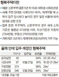 올해 처음 입주하는 '행복주택' 847가구가 평균 10.4대1의 청약경쟁률을 기록했다. 그러나 일부 신혼부부용 행복주택에서는 미달(未達) 사태가 빚어졌다.